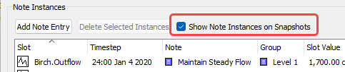 The Show Note Instances on Snapshots option is selected by default. When the box is not checked, note instances that are on snapshot slots will not be shown in the Note Instances panel. This setting is saved in the model file.
