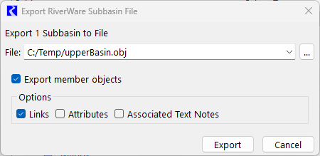 Figure 7.3 The Export RiverWare Subbasin File dialog with the Export member objects option selected.