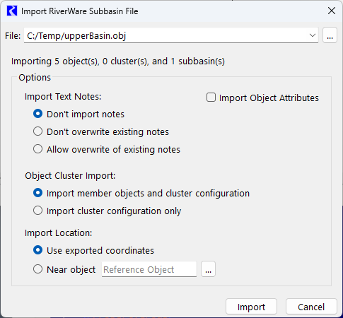 Import with the File and then Import Subbasins menu. This opens the Import RiverWare Subbasin File window. If the selected file also contains objects, then the window contains the same options as when importing the objects themselves.