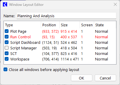 • The controls to Close all windows before applying layout. When checked, when the layout is applied, first all windows will be closed and then the layout is applied. The close behavior is identical to shift-clicking the Close Windows button (i.e. the lightning bolt). This feature allows you to switch between layouts, closing all other windows before applying the new layout. Note, the workspace associated windows (object list, run controls, etc) are never closed.