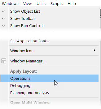 Window Layouts allow you to save the size, position, content, and status of many windows. The layout can be applied on demand to open the windows in their saved locations and sizes. In this section, we refer to windows and content; for example the Object Viewer is a window while the specific objects that are shown in the viewer, is the content. Some windows have content that can change and some do not.