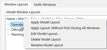 Figure 2.7 Window Layouts panel shown with three model layouts and three per-user layouts