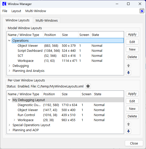 Most operations involving layouts are performed from the Window Manager including creating and applying layouts. This section describes these operations in detail. These operations are the same for both Model and Per-User Layouts. For Per-User layouts, you must enable them first and specify the file. See