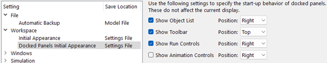 On the right, for each panel, select whether to show the panel and its position. As noted, this is the startup behavior and does not affect the current display. Also note, these settings are preserved in the settings file, not in the model.