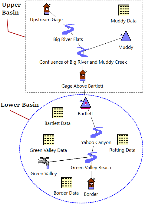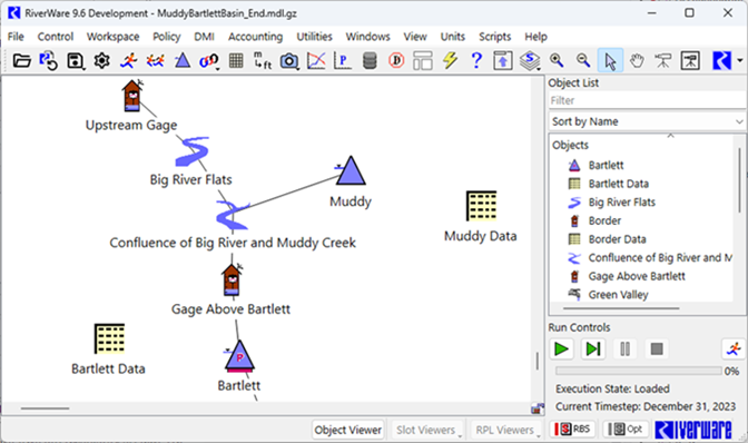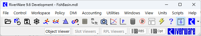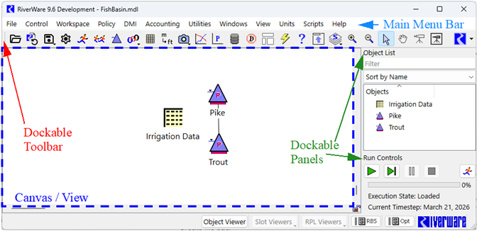 The workspace features a main menu bar in which the various functions of RiverWare are organized into menus. The workspace also contains a dockable toolbar featuring shortcut buttons to some key RiverWare operations and utilities. There is also a dockable object list panel of all the objects on the workspace and a dockable run control panel. A screenshot of the workspace is shown in
