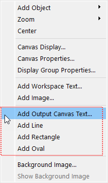 • Add Output Canvas Text, Shapes, or Lines: Text, rectangles, ovals, and canvas lines are supported. (Images are not currently supported.) Items can be added from the workspace, but they actually live on a system output canvas. All placement is done on the workspace but configuration of colors, widths, and fonts is done from the output canvas. As a result, these items are highly customizable. For more information, see