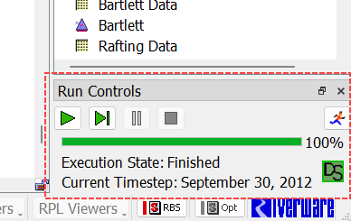The Run Controls Panel provides quick access to the common buttons used to make a run. It is shown by default in the lower right corner of the workspace, below the Object List, but can be detached or moved to other locations as desired.