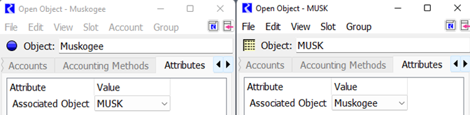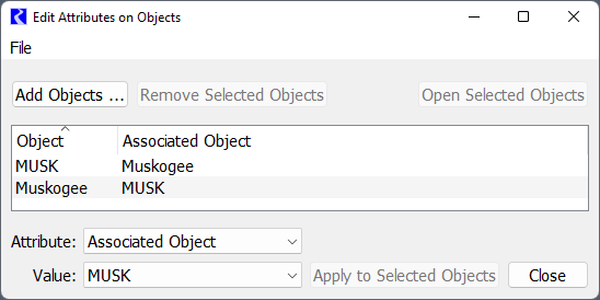 On each object, the value for the Associated Object should then be selected. That is, for the MUSK data object, the Muskogee attribute should be select. For Muskogee, the MUSK attribute should be selected. The following screenshot shows this example: