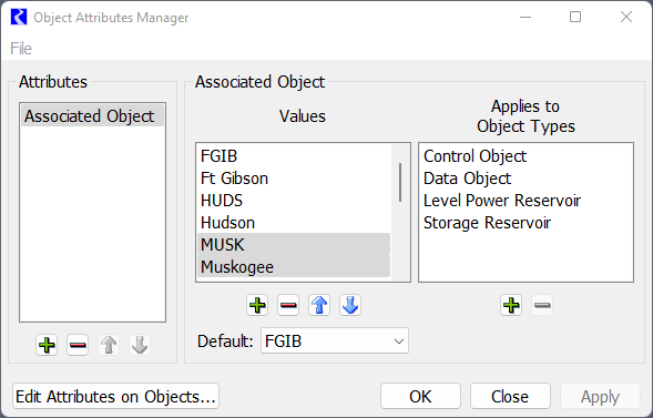 In the Attribute Manager, an attribute “Associated Object” is defined. Values for each Control Point, Reservoir and Data Object are then defined with the Name as the Value. The following screenshot shows the Attribute and Values for FGIB, Ft Gibson, HUDS, Hudson, MUSK, and Muskogee.