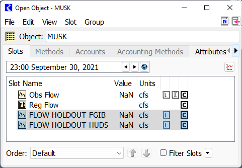 These slots should have unit type of FLOW. Use the copy/paste or Copy Slots to Objects functionality to quickly duplicate a slot to many objects. A sample of the two slots on MUSK is shown in the screenshot: