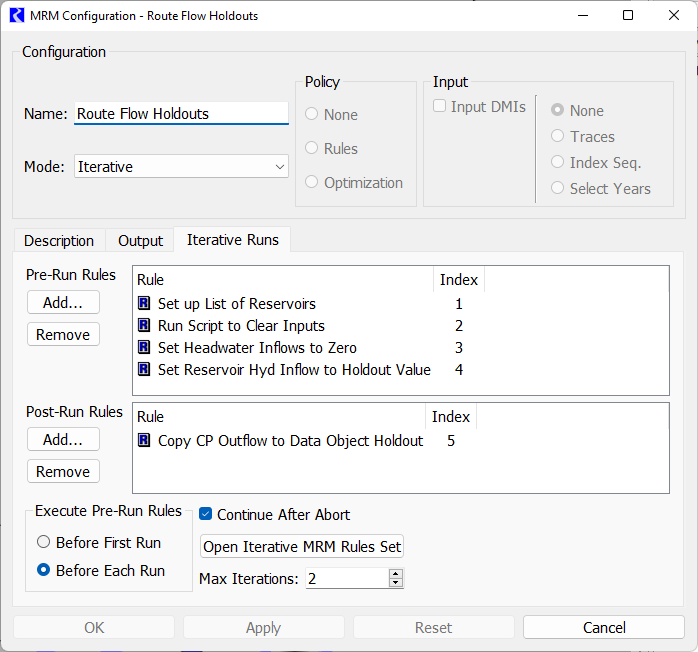 • Execute Pre-Run Rules: Must remain as Before Each Run as we want to execute rules 1-4 before each reservoir is processed.