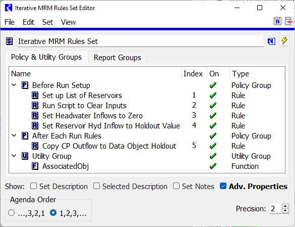 We will note that the Agenda Order is set to 1,2,3... as that makes the most sense for MRM rules. Each rule is only executed once. There are 5 rules in this set in two groups. The following screenshots show the logic in case the sample model is not available.