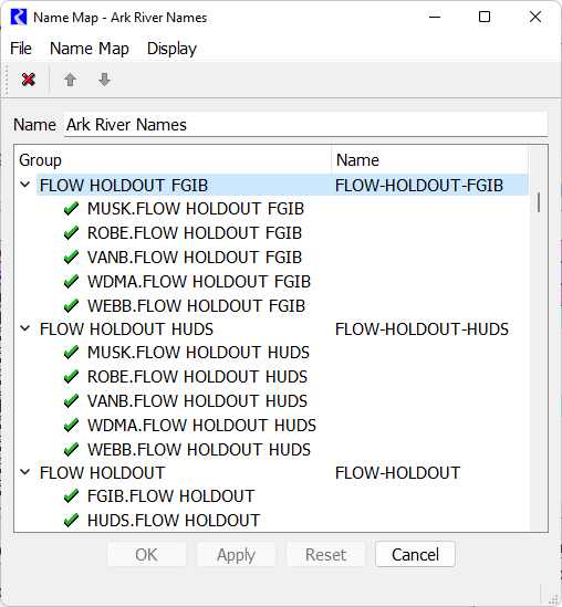 To send the resulting data out to DSS files, a Database DMI and a Name Map are required. We will not cover that here, except to note that the slots created in this sample basin are on the data object. A name map is required if the part information does not match the slot names. Here, we have slot names RES.FLOW HOLDOUT and CP.FLOW HOLDOUT RES while the names in the DSS file have hyphens: FLOW-HOLDOUT and FLOW-HOLDOUT-RES. Unfortunately slot names in RiverWare cannot contain hyphens or we could have changed the slot names to match the DSS file path names. As a result we created the following Name Map to do that translation.