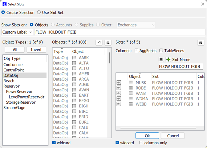 • On each Control Point Data Object: one series slot for each upstream reservoir with the naming convention: FLOW HOLDOUT RES. For example, the MUSK data object has slots for FLOW HOLDOUT FGIB and FLOW HOLDOUT HUDS.