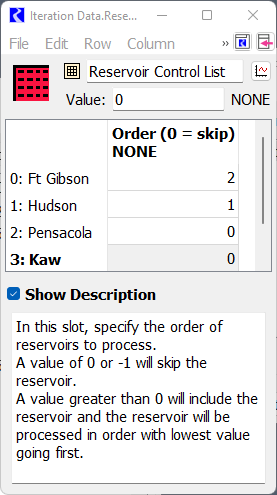 • Reservoir Control List: This table slot has one row per reservoir. The row labels must match the reservoir object name exactly. The values in the cells indicate if that reservoir should be considered and allows the order of reservoirs to be defined. See the description on the slot for information on specifying the order.