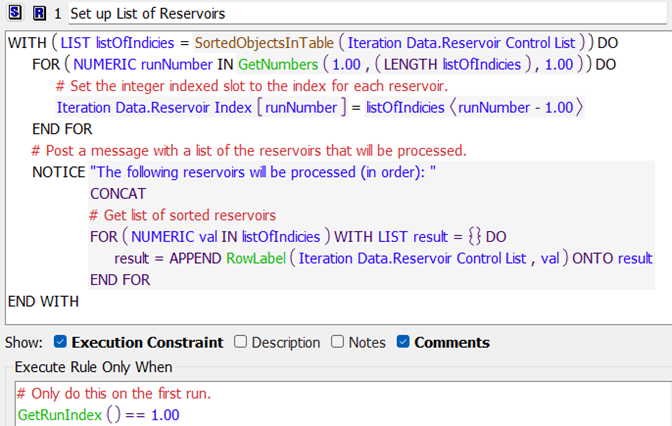 Figure 4.3) sets up a list of the reservoirs to process. The list filters out any reservoirs that are specified to be skipped and then is sorted by the user specified order. The reservoir index is written to the Iteration Data.Reservoir Index slot, one reservoir per row where each row represents one run to make.