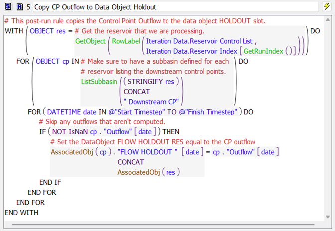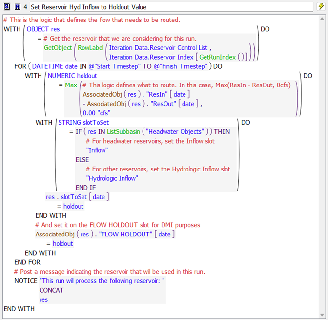 Figure 4.7) loops over each downstream control point (using the reservoir’s Downstream CP subbasin), and writes the Control Point.Outflow to the flow holdout slot for that reservoir, FLOW HOLDOUT RES (