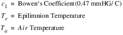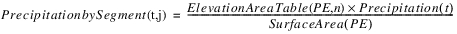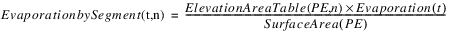 The evaporation leaving each segment and the precipitation entering each segment is based on the proportion of total surface area in each segment. The proportion of total surface area in each segment is calculated using the Elevation Area Table by Segment. The following equations calculate the evaporation and precipitation in each segment, n.