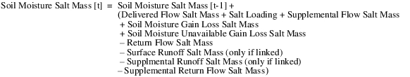 Next, compute Soil Moisture Gain Loss Salt Mass. Remember that Soil Moisture Gain Loss is a term that can be specified by the user as a miscellaneous addition or subtraction from the soil moisture. In addition, it is used to track the change in Soil Moisture volume if the irrigated area changes from one timestep to the next. As a result, the salt calculations must mirror these uses.