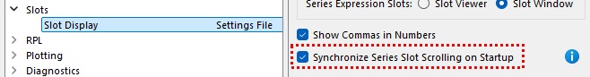 On the Settings Manager Slot Display page, the label was updated for the setting “Synchronize Series Slot on Startup” to reflect the behavior of the setting. Previously the label was “Synchronize Scrolling on Model Load.” The behavior of the setting did not change. The new label reflects the behavior, which is to control default scrolling behavior when starting a new RiverWare session, not when opening a new model, as the old label suggested. This addresses the issue filed as RW-7206.