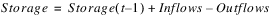 The mass balance equation may include the effects of evaporation, bank storage, seepage, or precipitation depending on the selected user methods. Inflow in the mass balance equation is the net inflow to the reservoir, including hydrologic inflows, return flows, and diversions if appropriate.