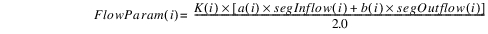 where i is the reservoir segment. K(i) is a calibration parameter dependent on previous Storage. segInflow(i) and segOuflow(i) are the calculated inflow and outflow of each segment and are local variables. Weighting factors, a(i) and b(i), determine to what extent Flow Param depends on the inflow and outflow of the segment.