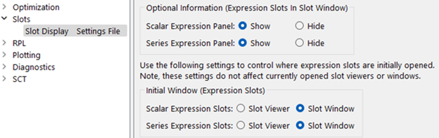 • Settings file settings now control in which type of window an expression slot is initially opened, either the Open Slot or the Slot Viewer. See the screenshot below.